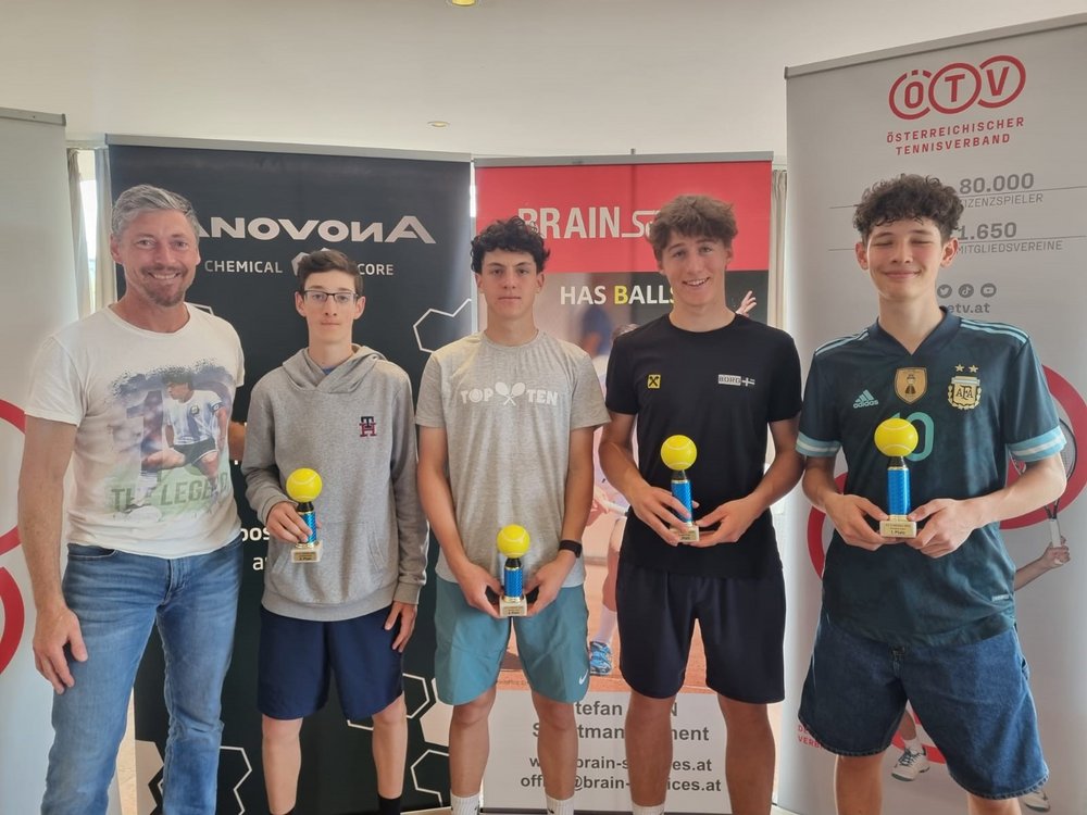 Bei der Siegerehrung von links nach rechts: Turnierleiter Stefan Hirn, Burschenfinalist Alexander Gschiel, Mädchensiegerin Anna Pircher, Burschensieger John Bothma, Oberschiedsrichter Gerhard Seidlmann.