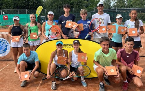 Die ÖTV-Jugend dominiert das Bild von der großen Sieger:innenehrung. Hintere Reihe: 2. von links Avril Illetschko, rechts daneben Lea Haider-Maurer, Ferdinand Grasl, Marcel Jelinek, Jannik Rochus El Filali. Vorne: 2. von links Julia Ehrenberger, rechts daneben Mia Neumüller.