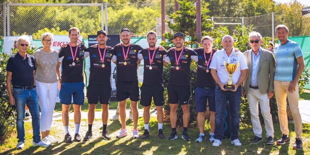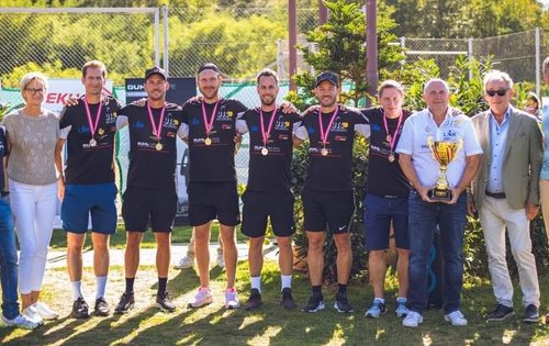 Die Siegermannschaft des UTC Neudörfl / WienInvest Group mit Senioren-Bundesliga-Wettspielausschussmitglied Stefan Hirn (ganz rechts) bei der Siegerehrung.