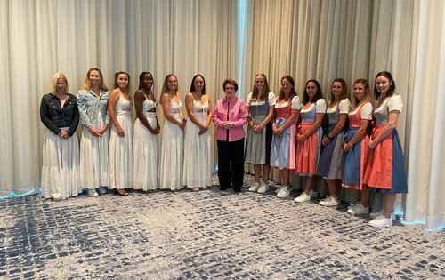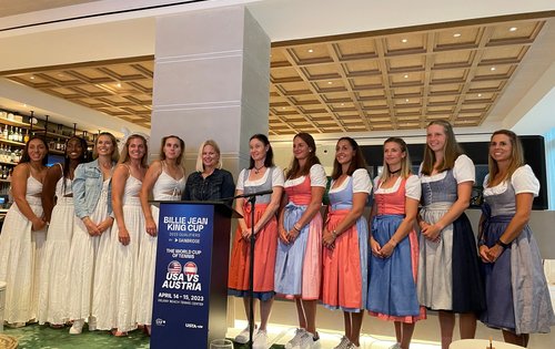 Am Mittwoch ab 18:00 Uhr Ortszeit ist beim Billie Jean King Cup USA gegen Österreich in Delray Beach (14./15. April) das Official Dinner auf dem Programm gestanden. Das Alpstar Austria Billie Jean King Cup ist dabei mit den Dirndln von Trachten Tostmann bestens ausgestattet gewesen. Auch US-Tennislegende Billie Jean King, Namensgeberin des Damen-Nationenwettbewerbs, ließ sich dazu im offiziellen Hotel „The Ray“ in Delray Beach blicken. Der Länderkampf wird an diesem Freitag (ab 18:00 Uhr Ortszeit = 24:00 Uhr MESZ) und Samstag (ab 14:00 Uhr Ortszeit = 20:00 Uhr MESZ) live auf www.oetv.tv übertragen.