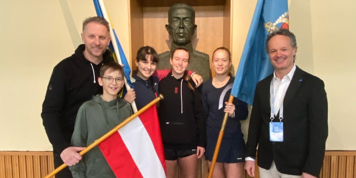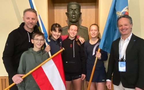 Von links nach rechts: Franz Kresnik (ÖTV-U14-Nationaltrainer), Anton Kahlig, Kara Fronek, Anna Pircher, Lea-Haider-Maurer und Thomas Hammerl (Tennis-Europe-Geschäftsführer) beim bedeutenden Event in The Royal Tennis Hall in Stockholm.