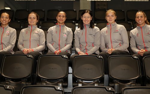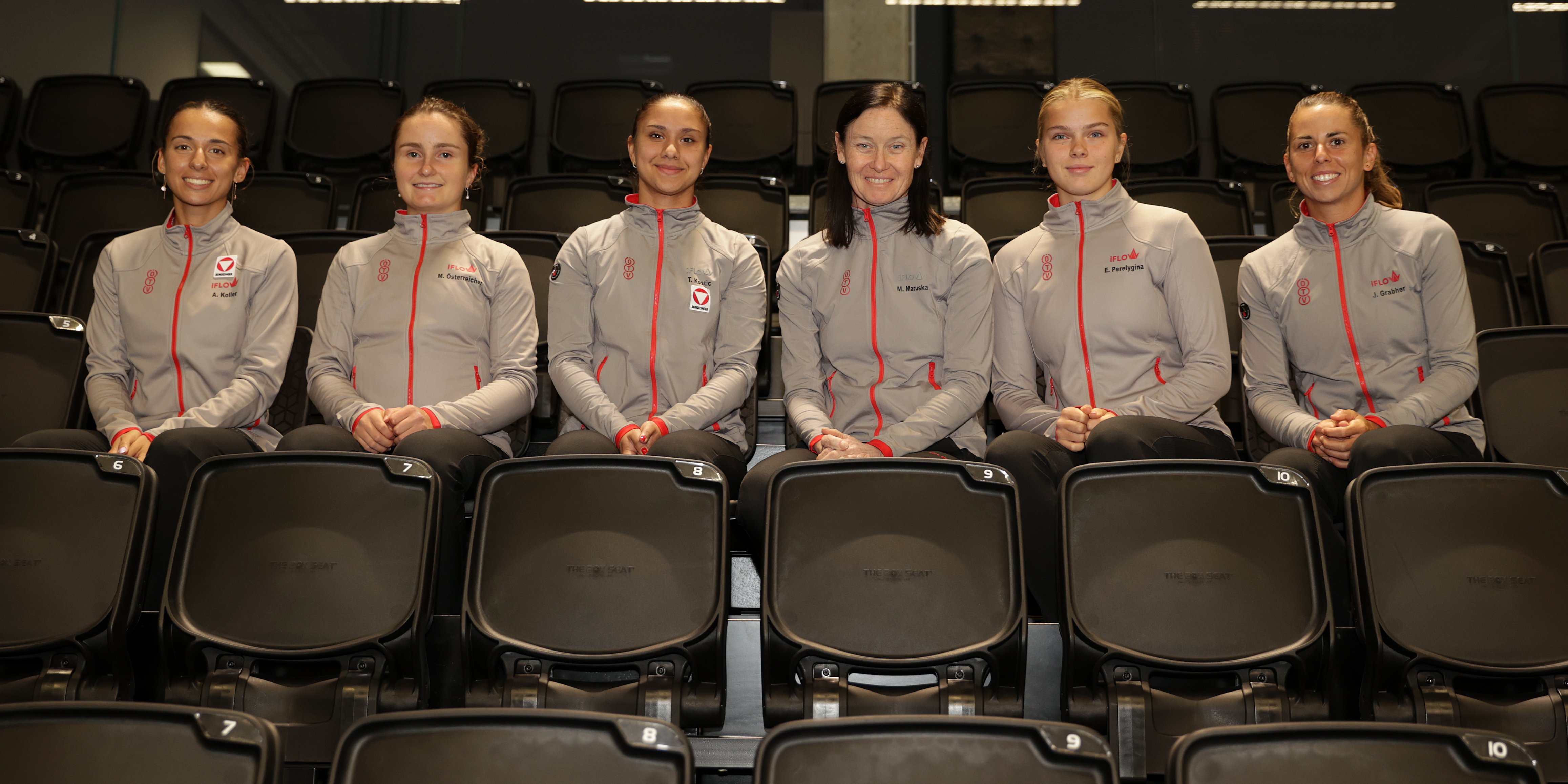 Österreichs Damen-Nationalmannschaft in Vilnius, von links nach rechts: Arabella Koller, Mavie Österreicher, Tamara Kostic, Marion Maruska (ÖTV-Sportkoordinatorin und -Billie-Jean-King-Cup-Kapitänin), Ekaterina Perelygina, Julia Grabher.