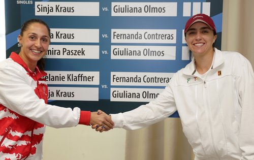 Für Kraus war es „eigentlich ganz egal, ob ich das erste oder zweite Match spiele. Es ist jetzt halt so gekommen wie im letzten Jahr – das heißt eigentlich ganz gut“, spielte sie lächelnd auf den damaligen 3:2-Überraschungssieg gegen Lettland an, am gleichen Ort. Ihre erste Kontrahentin Olmos kenne sie von deren Namen her „nur aus dem Doppel, aus dem Einzel gar nicht. Ich denke, ich muss hier aber trotzdem sehr fokussiert spielen und wirklich meine Leistung abrufen – weil sie eine sehr routinierte Spielerin ist und uns auf jeden Fall damit überraschen wird, was sie alles drauf hat, dadurch dass wir eben keine Erfahrungen mit ihr im Einzel haben.“ Mit dem vorwöchigen, bislang größten Titelgewinn in ihrer Karriere beim ITF-W40-Turnier in Heraklion auf der griechischen Insel Kreta habe die Wienerin jedenfalls viel Selbstvertrauen getankt: „Ich habe mich letzte Woche sehr wohl gefühlt, habe wirklich gutes Tennis gezeigt und hoffe auf jeden Fall, dass ich diese Leistung dieses Wochenende wieder abrufen kann. Ich freue mich darauf. Wir fühlen uns alle sehr wohl im Team, das sind beste Voraussetzungen.“ Dass sie wegen des Ausfalls von Julia Grabher die Rolle als Nummer eins im Team und Führungsspielerin annehmen muss, damit ging die 21-Jährige locker um: „Eigentlich fühle ich mich immer noch wie das Bambi im Team, aber wir haben jetzt ein neues Bambi“, grinste sie Richtung Kostic. „Deswegen muss ich jetzt die Führungsrolle im Team als Nummer eins übernehmen. Wir haben aber auch zwei sehr, sehr erfahrene Spielerinnen dabei – also wir sind eine gute Mischung“, befand sie.