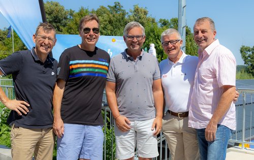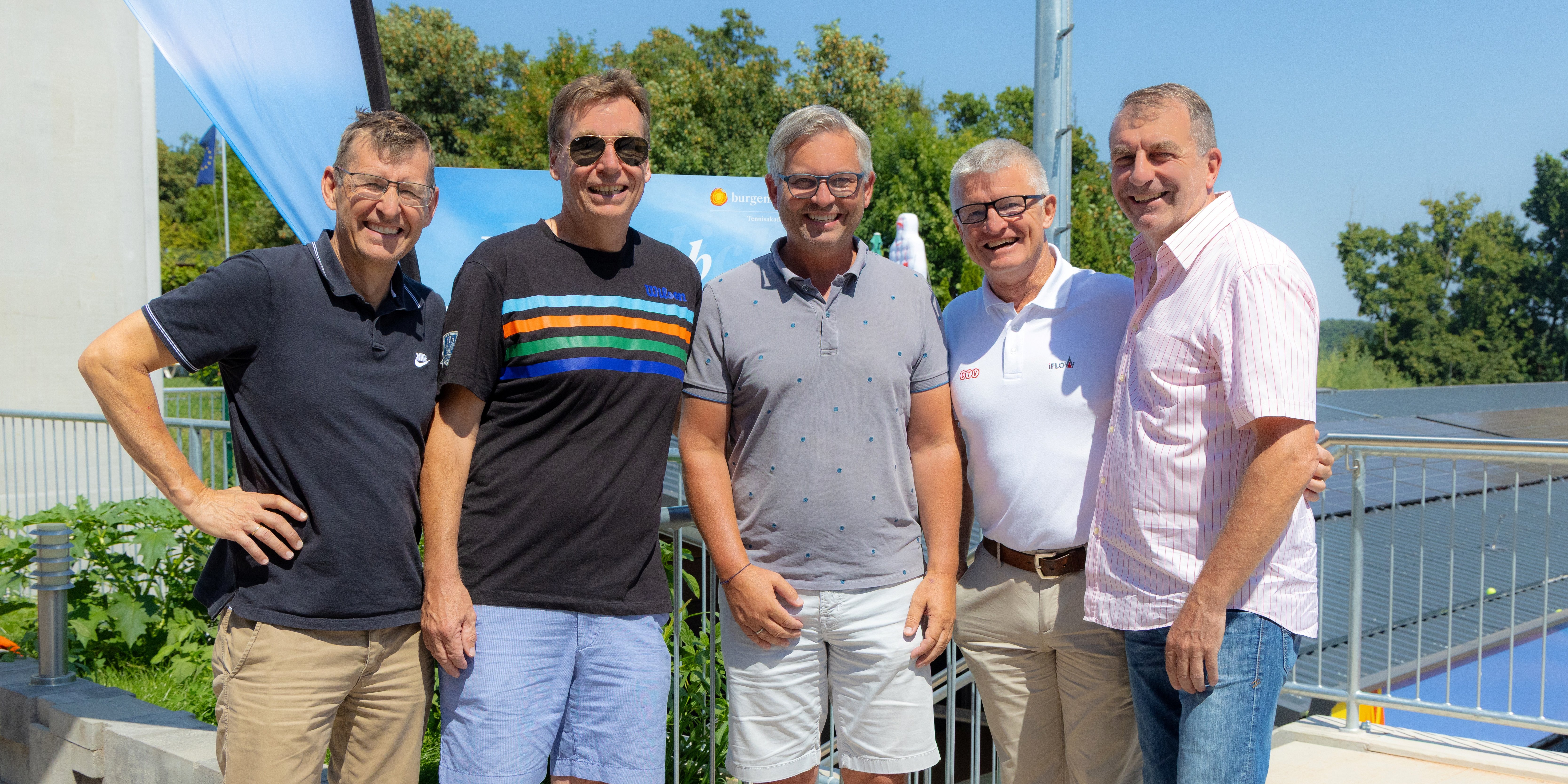 Prominenter Besuch bei den Drei ÖTV-Jugendmeisterschaften 2025 U12/U14/U16 in Oberpullendorf. Von links nach rechts: Peter Dopler (Prokurist für Kommunikation und Projektmanagement in der Landesholding Burgenland), Christian Zulehner (STV-Präsident), Magnus Brunner (Ex-ÖTV-Präsident, EU-Kommissar für Inneres und Migration), Thomas Schweda (ÖTV-Geschäftsführer Wirtschaft), Günter Kurz (BTV-Präsident und Veranstalter).