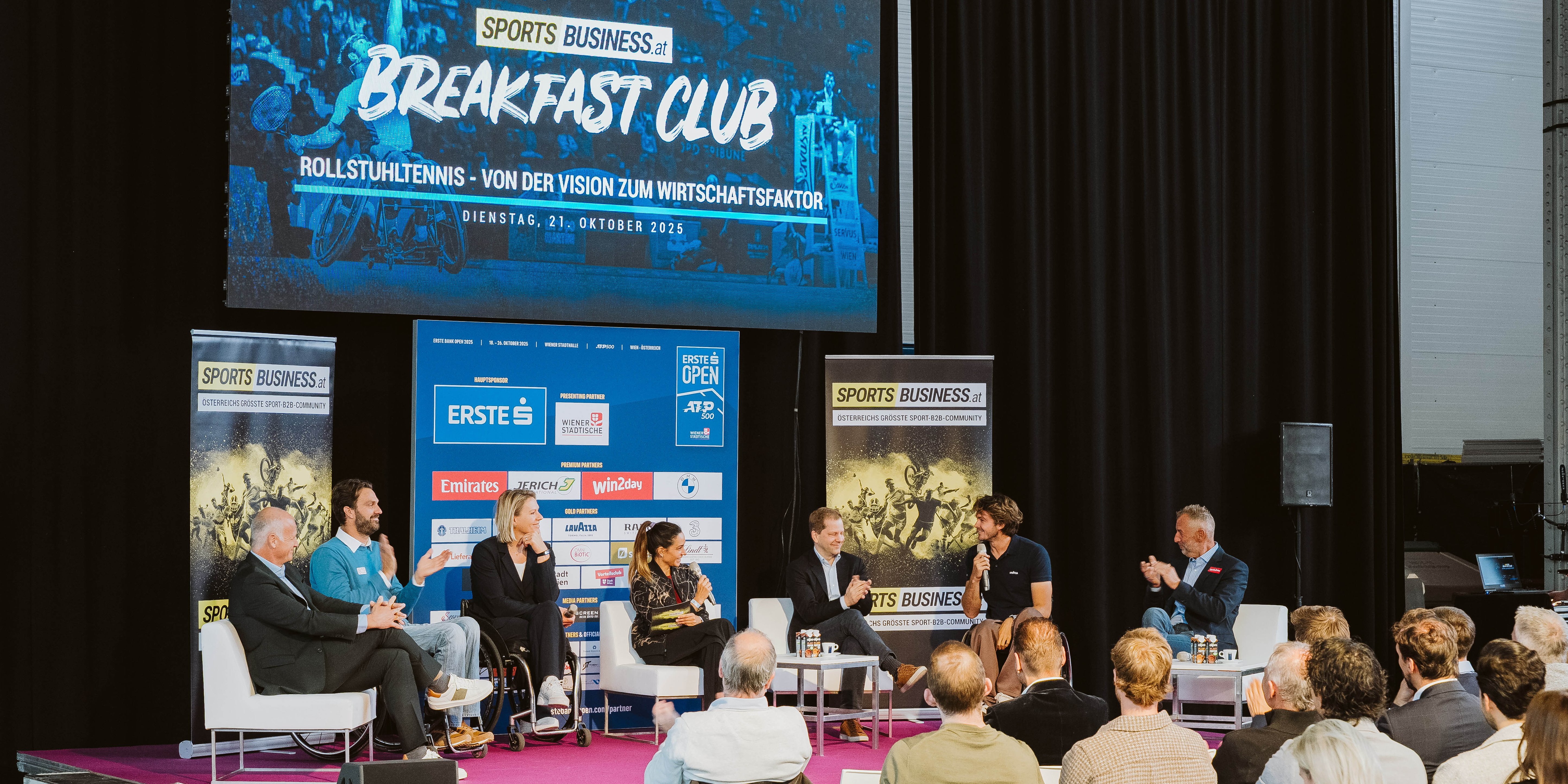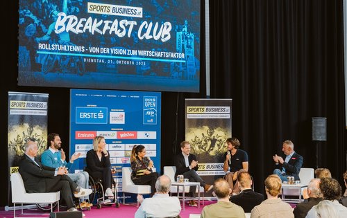 Die Marx Halle ist bunt, laut und inklusiv! Matches der Erste Bank Open, Trainings der Topstars und ein Rollstuhltennisturnier. Am Dienstag wurde die legendäre Location im 3. Wiener Gemeindebezirk zum Schauplatz für den sportsbusiness.at Breakfast Club. Das Thema: Rollstuhltennis – von der Vision zum Wirtschaftsfaktor. Das Line-up der hochkarätigen Podiumsdiskussion: Rollstuhltennis-Ass Nico Langmann, Erste-Bank-Open-Turnierbotschafter Thomas Muster, Erste-Bank-Open-Turnierdirektor Herwig Straka, Rollstuhltennis-Weltklassespielerin Esther Vergeer, win2day-Managing-Director Georg Wawer, ÖTV-Inklusionsleiter Roman Zechmeister.