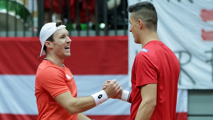 Die Fans kamen in der Halle auch an diesem Tag voll und ganz auf ihre Rechnung, zuerst in Form eines dramatischen Doppels. Mit einer 5:1-Davis-Cup-Bilanz waren Erler/Miedler als klare Favoriten in die Partie gegangen – doch Österreichs Paradedoppel wurde durch Kaukovalta/Niklas-Salminen vor eine richtig harte Prüfung gestellt. Das ÖTV-Paar stand bei 4:6 und 0:2 bzw. 1:3 im zweiten Satz genauso bereits mit dem Rücken zur Wand wie bei 5:6 im Tiebreak, wehrte den Matchball jedoch durch einen Erler-Volleypunkt ab. Beim zweiten Satzball retteten sich die beiden noch in den dritten Abschnitt, der ohne Breaks erneut in die Kurzentscheidung ging. Hier lagen Erler/Miedler gar mit 0:5 zurück, drehten aber, angepeitscht von der großartigen Heimstimmung um den österreichischen Davis-Cup-Fanclub, den Spieß noch um, nützten ihren zweiten Matchball – und verwandelten das Multiversum Schwechat in ein Tollhaus, mit kollektivem Jubel in Rot-weiß-rot. „Die Finnen haben richtig gut begonnen, wir mussten einen Weg finden. Beim 0:5-Rückstand haben wir den Sieg nicht mehr erwarten können, aber wir sind sehr froh, es vor unserem Heimpublikum noch geschafft zu haben und dass unser Team den Länderkampf hiermit gewonnen hat“, strahlte Miedler. „Man spielt halt einfach weiter, Punkt für Punkt – und irgendwie haben wir es noch geschafft, das Match zu gewinnen“, atmete Erler nach der erfolgreichen Aufholjagd durch. „Wir haben alle Matches im dritten Satz gewonnen. Wir sind sehr glücklich darüber und freuen uns schon jetzt auf den nächsten Länderkampf.“