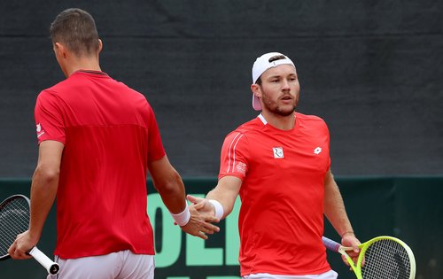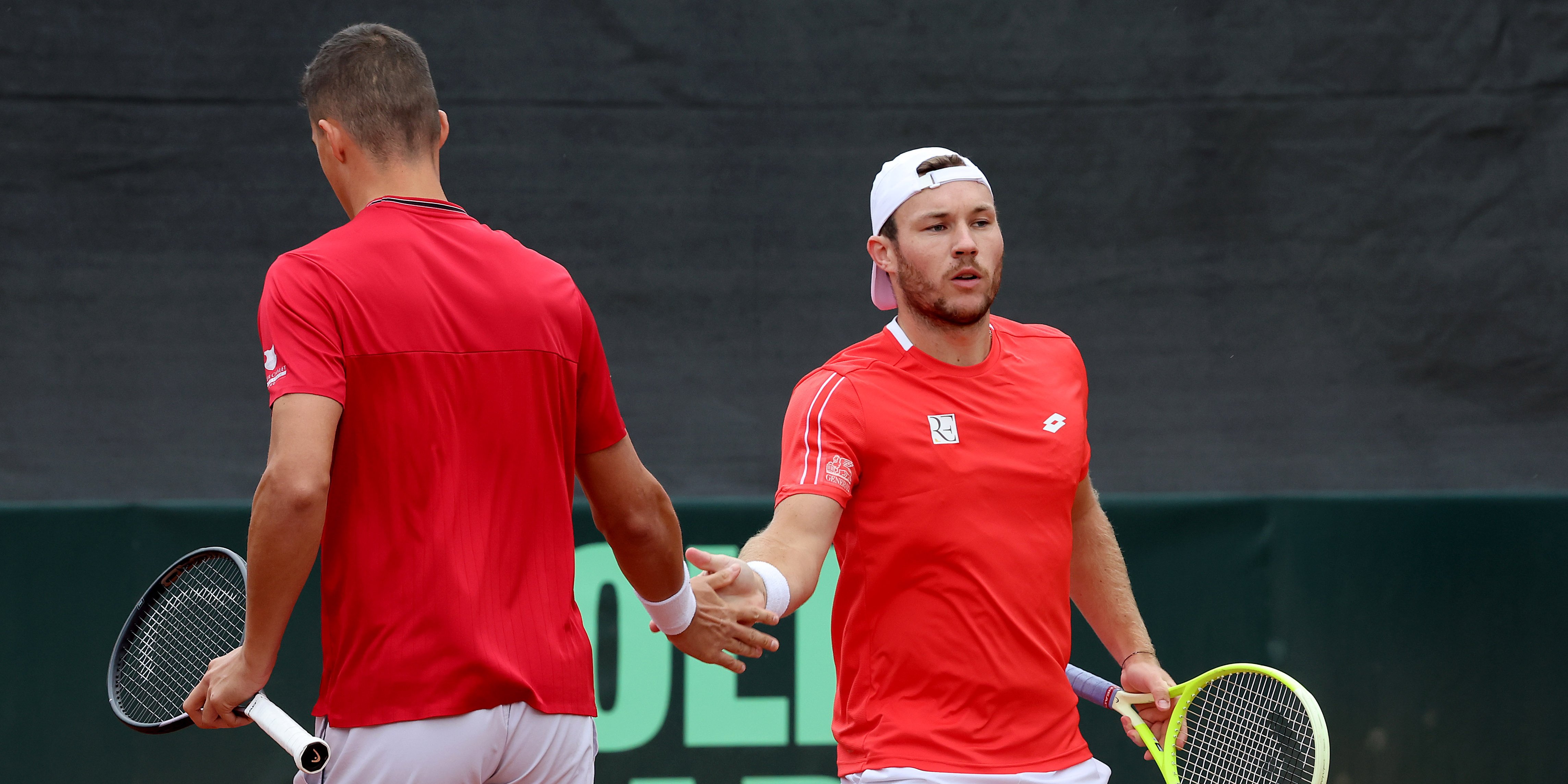 Um 9:30 Uhr hätte das Doppel am Sonntag im Sportaktivpark Bad Waltersdorf eigentlich starten sollen, aber das Wetter hatte einmal mehr an diesem langen Wochenende etwas dagegen. Nach einer stürmischen Nacht hatte in der Früh wieder Regen eingesetzt. Das Platzarbeiterteam leistete jedoch einmal mehr ganze Arbeit, und so konnte letztlich um 13:00 Uhr mit dreieinhalbstündiger Verspätung begonnen werden, bei freiem Eintritt für alle Zuschauer:innen. ÖTV-Vizepräsident Jürgen Roth, ÖTV-Geschäftsführer Wirtschaft Thomas Schweda, STTV-Präsidentin Barbara Muhr und viele weitere bekannte Gesichter aus der rot-weiß-roten Tennis- und Tennisverbandswelt und nicht zuletzt auch der ÖTV-Davis-Cup-Fanclub feuerten das Austrodoppel wie an den vergangenen Tagen lautstark an. Bei ihrem – durch kürzliche Wadenprobleme Miedlers – ersten gemeinsamen Auftritt seit zwei Monaten lieferten Erler/Miedler eine äußerst konzentrierte Vorstellung ab und hatten ihre Gegner bei nassen, stürmischen und also schwierigen Bedingungen zu jeder Zeit unter Kontrolle. Ihre eigenen Aufschlaggames spulten die beiden meist im Eiltempo ab, ließen bis zuletzt keine einzige Breakchance gegen sich zu. Selbst konnten sie zwar einige Möglichkeiten nicht verwerten, doch zwei Breaks zum 4:2 im ersten Satz und zum 4:3 im zweiten Abschnitt genügten ihnen letztlich zum sicheren Erfolg im oststeirischen Thermen- und Vulkanland. Für das top eingespielte, heimische Spitzendoppel war es im Davis Cup in Diensten Österreichs bereits der fünfte Sieg im sechsten Match.