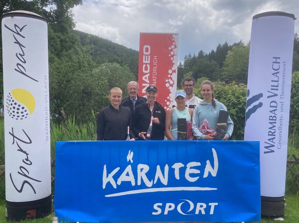 Die Siegerehrung im Damendoppel, von links nach rechts: 2. Karolína Kubánová, Jakob Hraschan (KTV-Vizepräsident und Panaceo-Geschäftsführer), 2. Renata Vorácová, 1. Nika Radisic, Stefan Winkler (Geschäftsführer Sportpark Warmbad-Villach), 1. Aneta Kucmová.