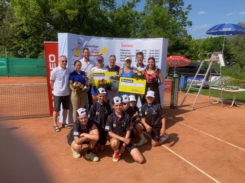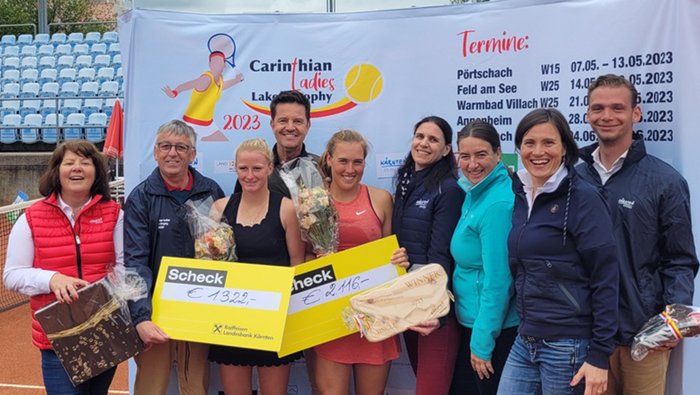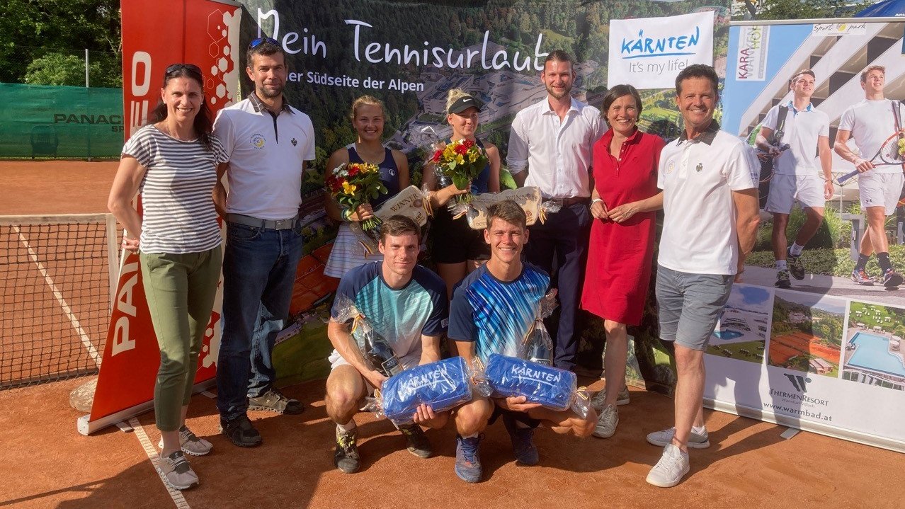 Auf dem Foto von links nach rechts stehend: Julia Adlbrecht (Turnierdirektorin), Stefan Winkler (Sportpark Warmbad-Villach), Jenny Dürst und Nika Radisic (Doppelsiegerinnen), Manuel Weiss (Referee), Elke Romauch (ÖTV-Vizepräsidentin), Gernot Dreier (Turnierdirektor). Knieend von links nach rechts: Sandro Kopp und Kai Lemstra (Doppelsieger).