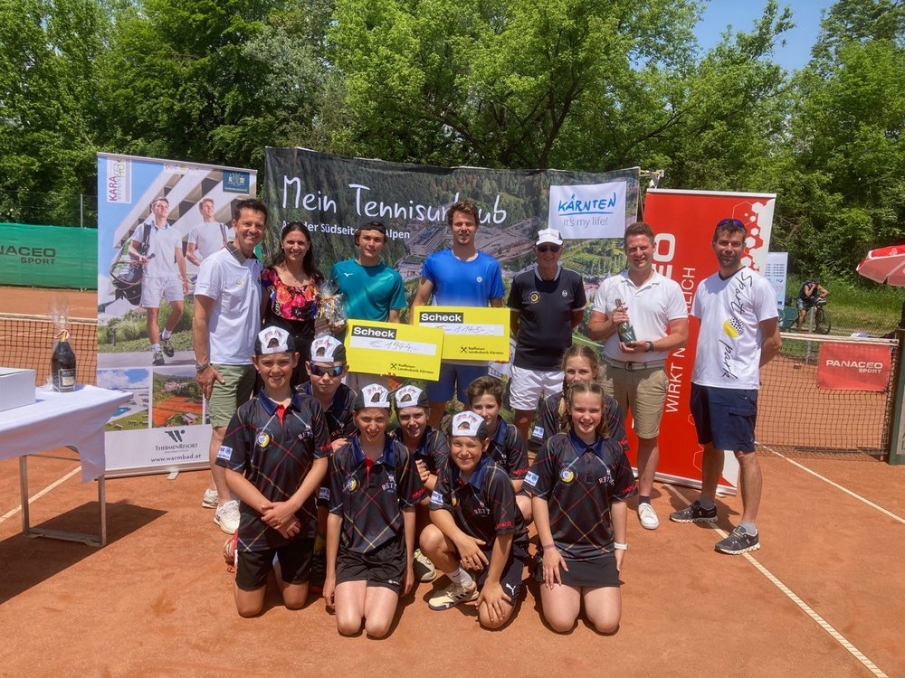 Die Siegerehrung im Herreneinzel, von links nach rechts stehend: Gernot Dreier (Turnierdirektor), Julia Adlbrecht (Turnierdirektorin), Alex Barrena (Sieger), Tim Handel (Finalist), Jakob Hraschan (Panaceo), Matthias Mayer (Schiedsrichter), Stefan Winkler (Sportpark Warmbad-Villach). Vorne knieend: Ballkinder.