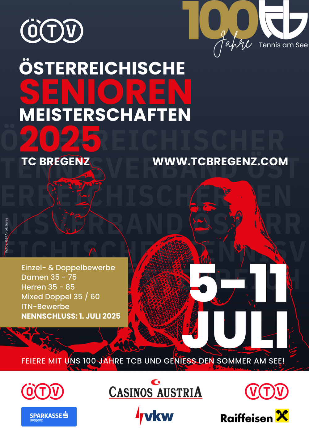 Vom 5. bis 11. Juli findet in Vorarlberg beim TC Bregenz, direkt am Bodensee gelegen, die Österreichische Seniorenmeisterschaft 2025 statt. Dieses Turnier wird das Highlight des Sommers – ein Event für alle Spielstärken und Altersklassen, das Einzel-, Doppel- und Mixed-Bewerbe beinhaltet. Separate ITN-Bewerbe geben auch Hobbyspieler:innen die Chance, mit dabei zu sein und einen Meister:innentitel in ihrem ITN-Bewerb zu erringen.