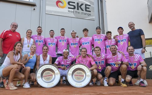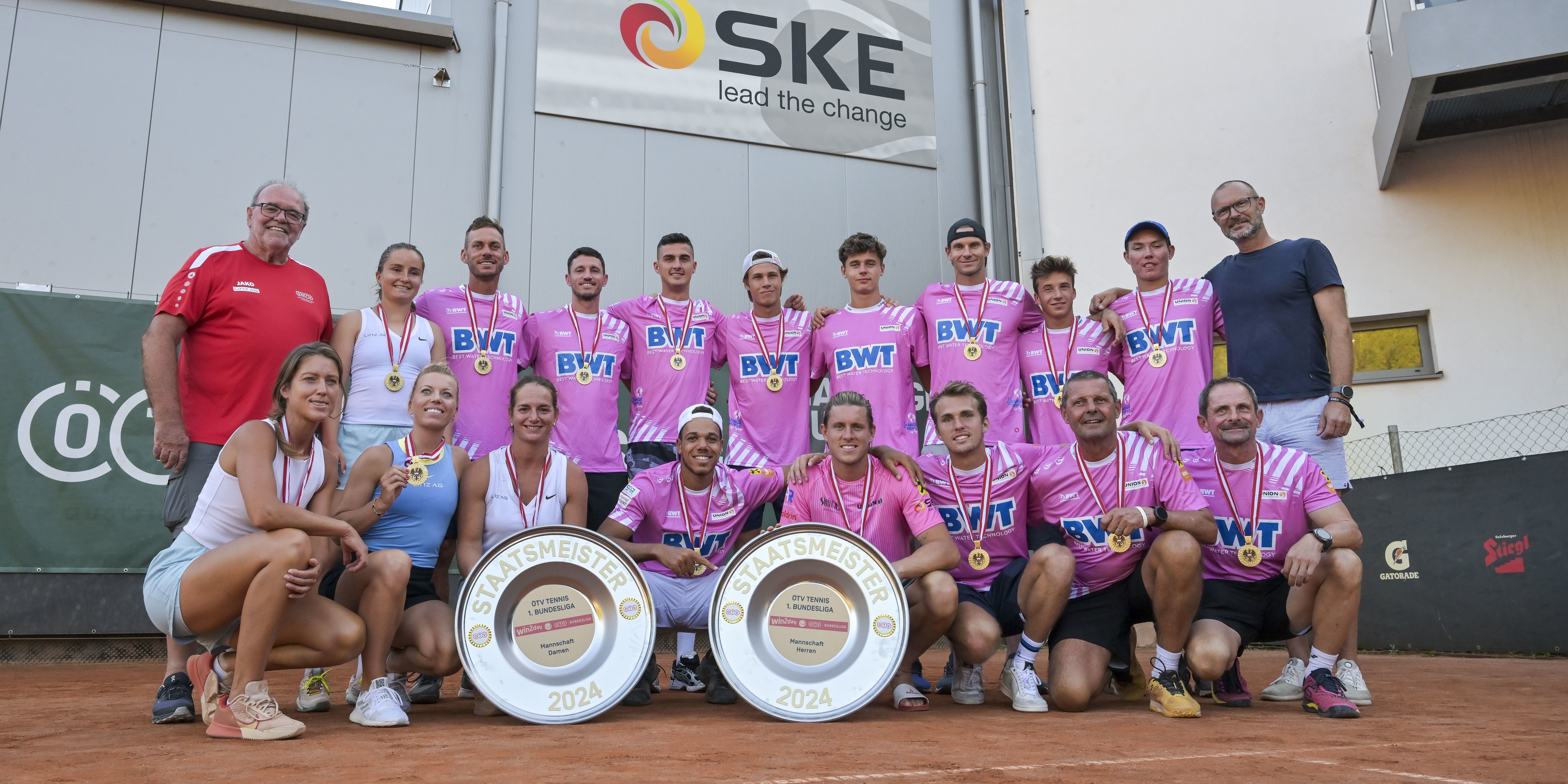 Die Entscheidungen in der höchsten Stufe der heimischen Mannschaftsmeisterschaft in der Allgemeinen Klasse sind am Samstag gefallen. Hochklassig besetzte und spannende Finalpartien in der win2day Bundesliga, auf der Anlage von Union Stein&Co Mauthausen, haben die, der Papierform nach, zu erwartenden Champions gebracht. Der Abschlusstag geriet dabei zu regelrechten OÖ-Festspielen, denn bei den Damen kürte sich das LINZ AG Team OÖ so wie im Vorjahr durch ein 4:3 im rein oberösterreichischen Endspiel über UTC Fischer Ried zum bereits fünften Mal am Stück nach 2020, 2021, 2022 und 2023 zu den Österreichischen Mannschafts-Staatsmeisterinnen. Und bei den Herren konnten sich die Gastgeber gegen TC Raiffeisen Schwaz aus Tirol mit 6:3 durchsetzen. Mit ihrem zweiten Coup nach 2020 sorgten die Mannen von Union Stein&Co Mauthausen für ausgelassene Partystimmung auf ihrer Heimatanlage – vor den Augen von Oberösterreichs Landesrat Stefan Kaineder, ÖTV-Geschäftsführer Wirtschaft Thomas Schweda und OÖTV-Präsident Hans Sommer, die den Finalbegegnungen bis zum Schluss begeistert beiwohnten.