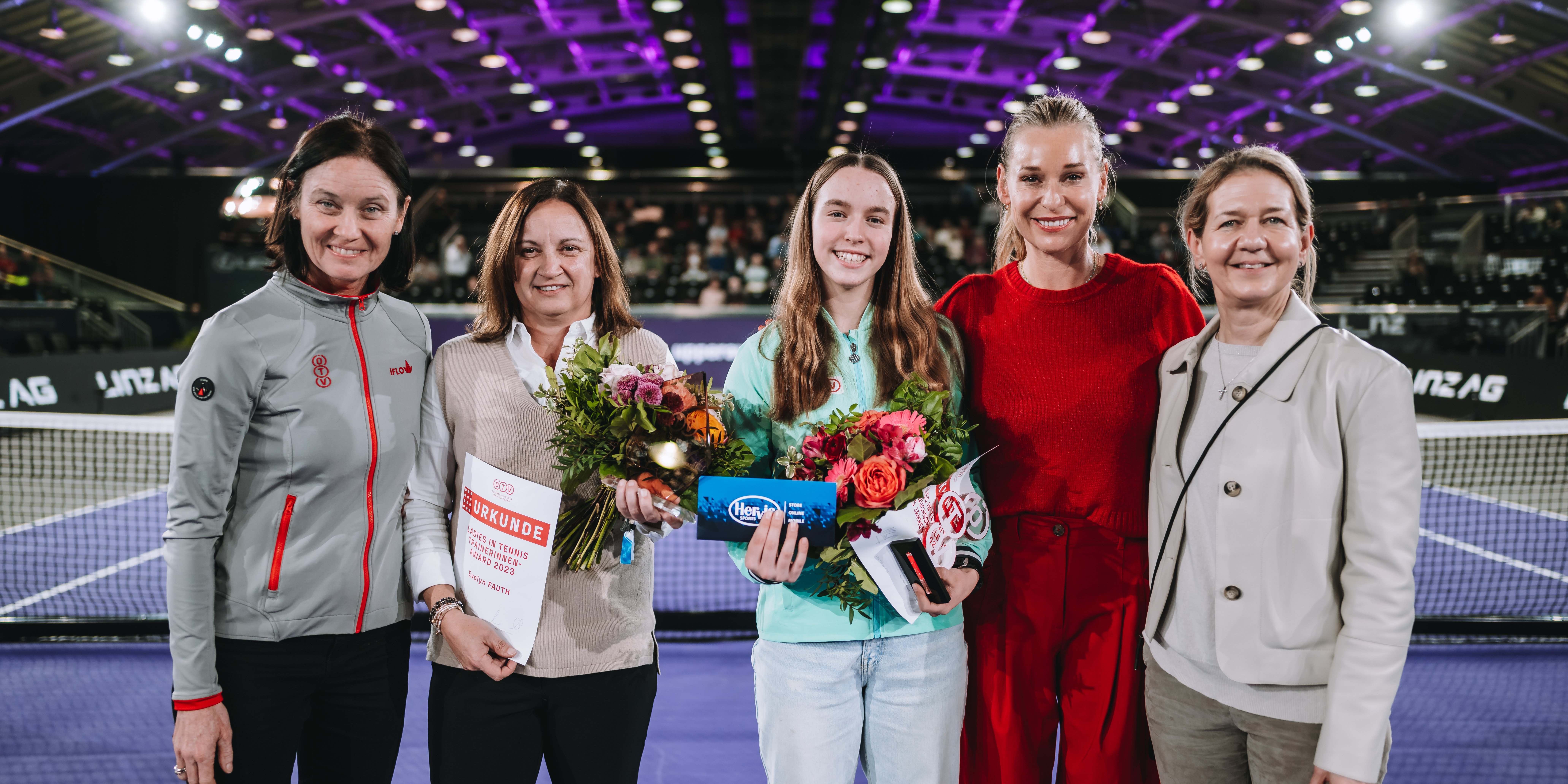 Von links nach rechts: Marion Maruska (ÖTV-Sportkoordinatorin und -Billie-Jean-King-Cup-Kapitänin), Evelyn Fauth (ÖTV-Trainerin des Jahres 2023), Anna Pircher (ÖTV-Nachwuchsspielerin des Jahres 2023), Barbara Schett-Eagle (Turnierbotschafterin Upper Austria Ladies Linz), Sandra Reichel (Turnierdirektorin Upper Austria Ladies Linz).