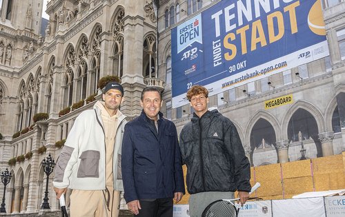 ● Das Wochenende nützen die Tennisstars einmal mehr zum Sightseeing in Wien. So statteten der Bulgare Grigor Dimitrov und der Italiener Jannik Sinner dem Megaboard-Riesentransparent am Rathaus einen Besuch ab. Empfangen wurde das Duo, das mittlerweile bereits zu den Stammgästen der Erste Bank Open zählt, von Finanzstadtrat Peter Hanke, der Dimitrov und Sinner auch den Rathaus-Innenhof zeigte. Der 21-jährige Sinner sparte danach nicht mit Komplimenten: „Wien ist eine wunderbare Stadt mit unglaublich schönen Sehenswürdigkeiten. Ich freue mich jedes Mal, wenn ich hierher zurückkomme“, schwärmte der Vorjahres-Halbfinalist.