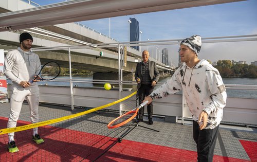 ● Der Kroate Borna Coric und der Argentinier Diego Schwartzman wiederum übernahmen bei einer Schifffahrt auf der Donau das Steuer. Davor gab es natürlich eine fachkundige Einschulung durch DDSG-Blue-Danube-Flottenkapitän Johannes Kammerer. Die beiden Tennis-Asse ließen es sich nicht nehmen, vor den Augen von Turnierdirektor Herwig Straka auf einem Minicourt auch einige Bälle über das Netz zu schlagen. „Es war sehr beeindruckend, Wien von einem Schiff aus zu besichtigen“, war Schwartzman vom Trip auf der Donau angetan.