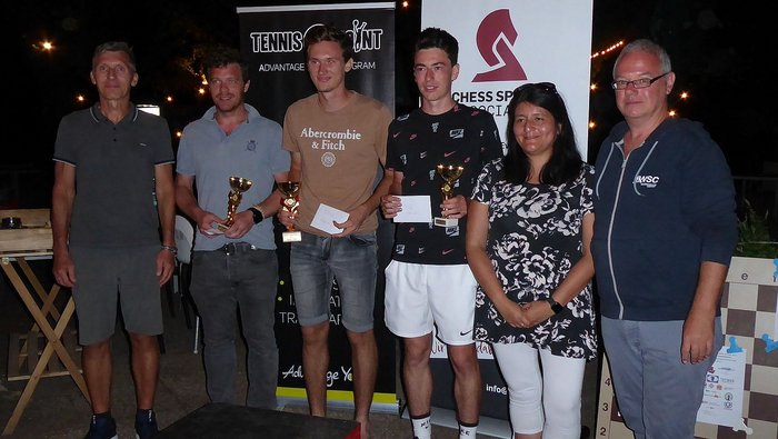 Bei der Siegerehrung von links nach rechts: Turnierleiter Yaroslav Srokovski, 2. Alexander Gschiel, 1. Sebastien Maze.