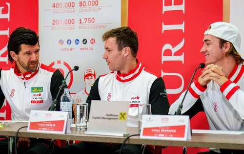 Einen Tag nach Österreichs Fußballnationalmannschaft in der WM-Qualifikation wird es auch für die heimischen Tennisherren ernst: Bei den Davis Cup Final 8 in Bologna spielt das KURIER Austria Davis Cup Team am Mittwoch ab 16:00 Uhr (live auf ORF 1 und ÖTV TV unter www.oetv.tv) gegen den zweifachen Titelverteidiger und Gastgeber Italien um einen Platz im Halbfinale. Vor der Abreise stellte sich die Auswahl von ÖTV-Sportdirektor und -Davis-Cup-Kapitän Jürgen Melzer Freitagvormittag bei einer Pressekonferenz beim Teamsponsor Raiffeisen Capital Management in Wien-Döbling noch allen Fragen der rot-weiß-roten Medienvertreter:innen.