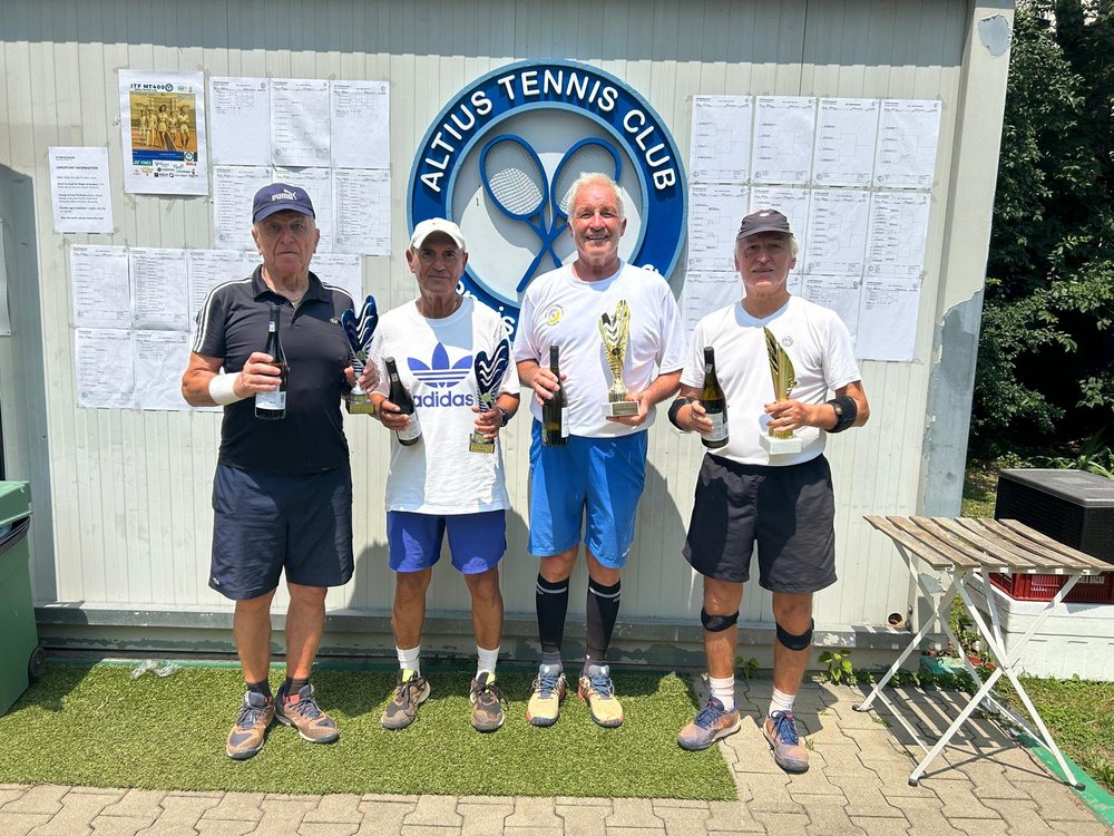 Die Siegerehrung im Herrendoppel 70+, von links nach rechts: 2. Ioan Craciun und Micky Zargary, 1. Josef Wiedner und Costel Coravu.