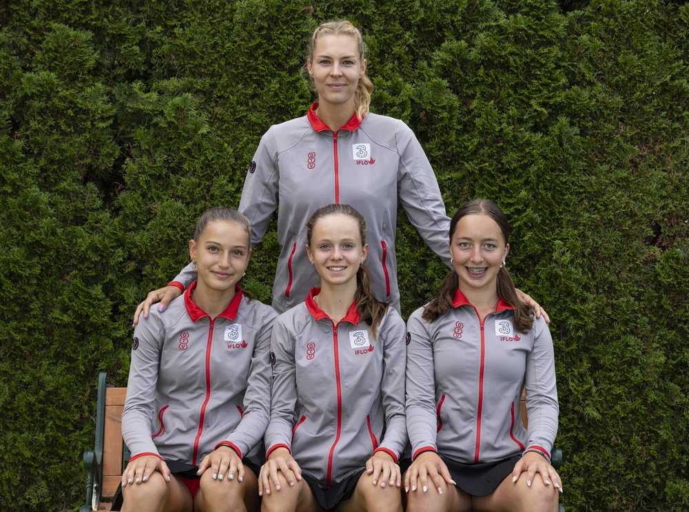 Österreichs Mädchen U14 bei den ITF World Junior Tennis Finals in Prostejov, vorne sitzend von links nach rechts: Julia Ehrenberger, Mia Neumüller, Marie Schmidhofer. Hinten stehend: Betreuerin Caroline Ilowska.