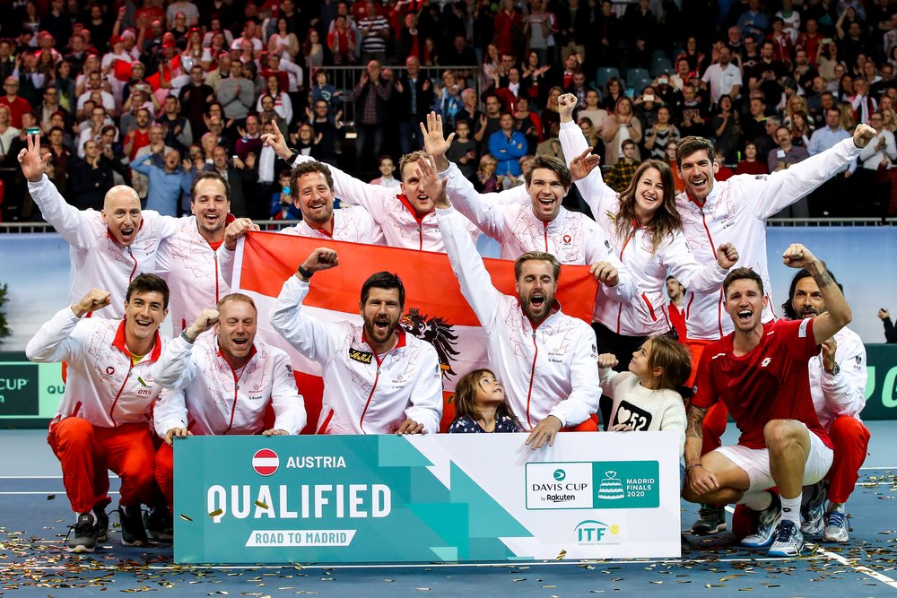2020/2021: Zwar nicht unter die letzten acht Nationen, aber zu einem echten Highlight brachten es die ÖTV-Herren nach der Davis-Cup-Reform von 2019 gleich bei der zweiten Ausgabe unter dem neuen Spielmodus – mit der erstmaligen Teilnahme am Finalturnier, und das daheim in Innsbruck. Doch zunächst brauchte es dazu einen Sieg über Uruguay, und der sollte am 6./7. März 2020 nach beinhartem Kampf auch eingefahren werden. Im Schwarzl Freizeitzentrum in Premstätten (Tennisfans insbesondere durch die legendäre Begegnung gegen Deutschland im Jahr 1994 bekannt) vertraute man gegen die sich auf Sand am wohlsten fühlenden Südamerikaner auf schnellen Hartplatz und Dennis Novak, der gegen Martin Cuevas auch gleich lieferte – 6:2, 6:4. Zwar musste sich Jurij Rodionov darauf hauchdünn dessen stets deutlich stärkerem Bruder Pablo Cuevas mit 7:6 (7), 3:6, 6:7 (5) geschlagen geben. Doch sowohl Marach/Melzer im Doppel gegen Ariel Behar und Pablo Cuevas (4:6, 6:3, 7:5) als auch Novak gegen Pablo Cuevas (2:6, 6:3, 6:4) behielten nach Satzrückständen die Nerven und sicherten den 3:1-Erfolg. Österreich zählte damit zu den stärksten 18 Ländern, bewarb sich um die Austragung von einer der damals noch sechs Finalturnier-Dreiergruppen – und bekam den Zuschlag. Mit Erzrivale Deutschland und Serbien wurden in Gruppe F zwei Topnationen und Publikumsmagneten hinzugelost. Einziger Haken daran: Die Coronaviruspandemie sollte die Austragung erst im November 2021 und kurzfristig nur vor leeren Rängen in der Innsbrucker Olympiahalle ermöglichen. Am 26. November wartete Serbien und ein bitterer Start: Gerald Melzer zog gegen Dusan Lajovic ganz knapp mit 6:7 (5), 6:3, 5:7 den Kürzeren. Novak verbuchte gegen Superstar Novak Djokovic fünf Games (3:6, 2:6), aber nicht den (auch nicht zu erwartenden) Punkt, um in der ersten Begegnung im Rennen zu verbleiben. Schlusspunkt: ein abermals enges 6:7 (4), 6:4, 3:6 von Marach und Philipp Oswald gegen Nikola Cacic und Filip Krajinovic im Doppel. Zwei Tage danach sorgte Rodionov mit einem tollen 6:1, 7:5 über Dominik Köpfer für einen viel erfreulicheren Auftakt gegen die Deutschen. Da Novak gegen Jan-Lennard Struff (5:7, 4:6) jedoch ebenso das Nachsehen hatte wie das Duo Marach/Oswald gegen Kevin Krawietz und Tim Pütz (3:6, 4:6), erfüllte sich die Hoffnung aufs Viertelfinale nicht.