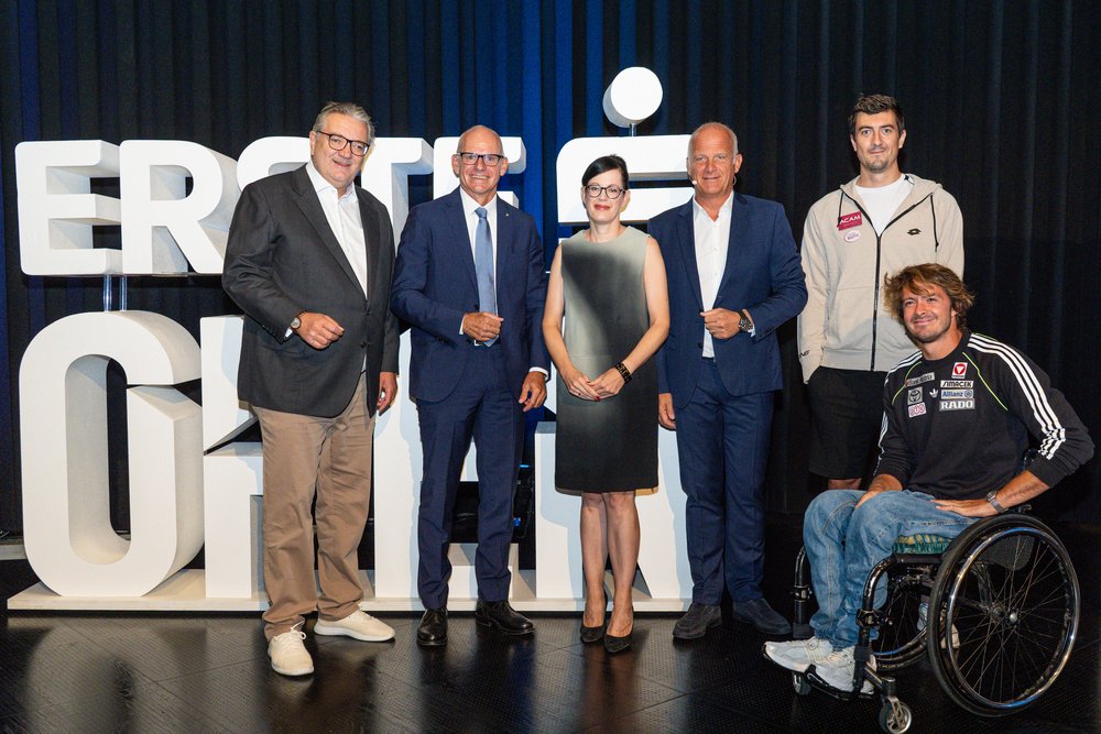 Bei der Pressekonferenz zu den Erste Bank Open, von links nach rechts: Peter Hacker (Wiens Stadtrat für Soziales, Gesundheit und Sport), Ralph Müller (CEO Wiener Städtische Versicherung), Gerda Holzinger-Burgstaller (CEO Erste Bank), Herwig Straka (Turnierdirektor Erste Bank Open), Sebastian Ofner, Nico Langmann.