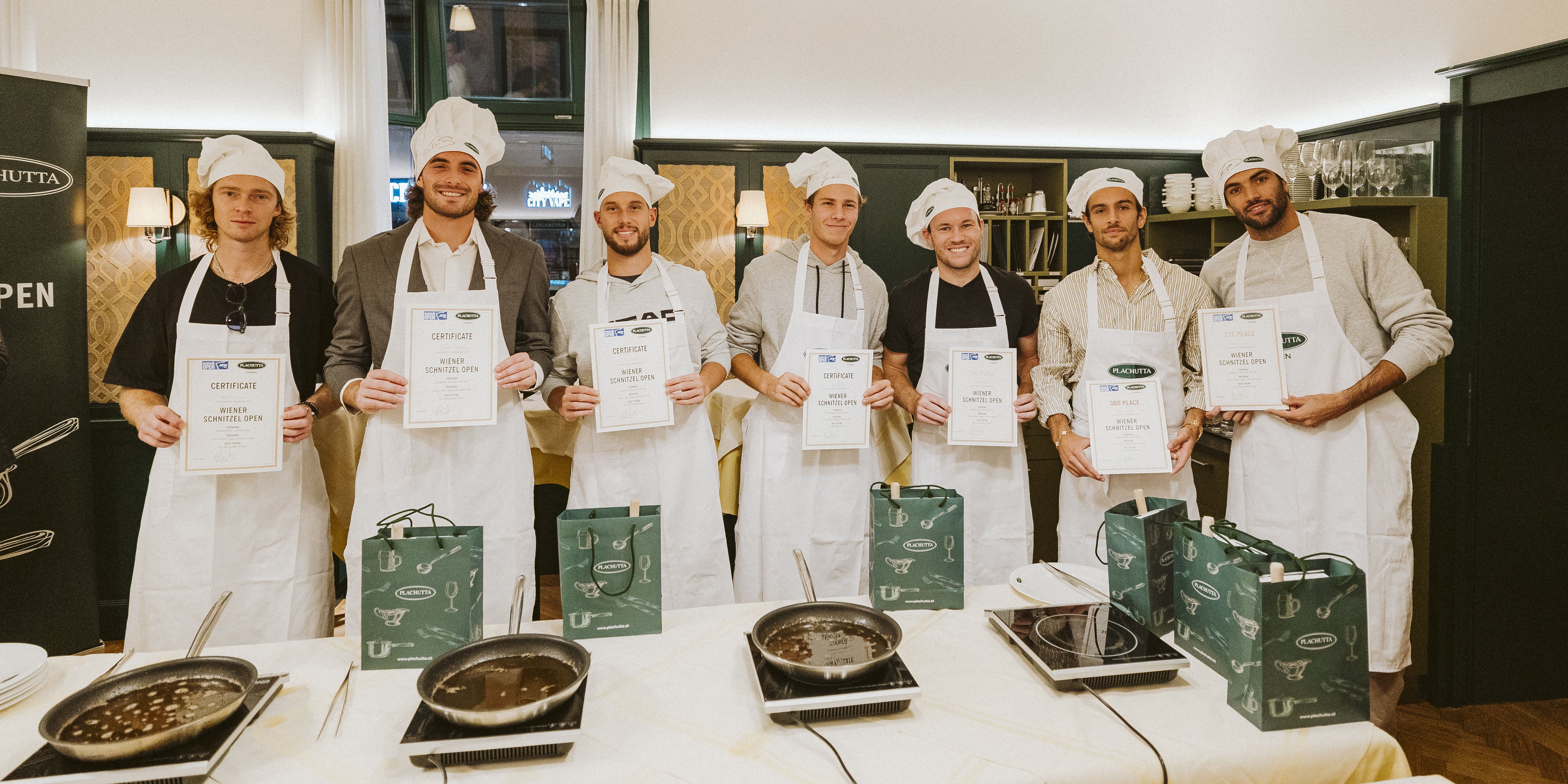 Heiß her ging es am Montagabend nicht nur auf dem Centre Court der Wiener Stadthalle, sondern auch in der Küche: Beim „Wiener Schnitzel Open“ bei Plachutta in der Wollzeile wagten sich die Turnierstars der Erste Bank Open an die Pfannen. Mit dabei: Filip Misolic, Lorenzo Musetti, Lucas Miedler, Andrey Rublev, Stefanos Tsitsipas, Joel Schwärzler und Matteo Berrettini – und auch der vierfache Grand-Slam-Champion Jannik Sinner schaute vorbei und sorgte mit seiner Anwesenheit für zusätzlichen Starglamour. Während Turnierbotschafter Thomas Muster prüfend über die Schultern blickte.