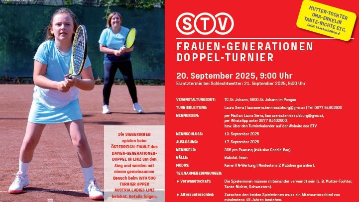 In den vergangenen Jahren wurde das Damen-Generationen-Doppelturnier erfolgreich in Salzburg – unter anderem beim UTC Oberalm und dem 1. Salzburger TC – ausgetragen. 2025 findet die beliebte Veranstaltung nun erstmals in St. Johann im Pongau statt. Am Samstag, den 20. September 2025, ab 9:00 Uhr, wird die Anlage des TC St. Johann zum Treffpunkt für tennisbegeisterte Frauen aus mehreren Generationen. Als Ersatztermin ist Sonntag, der 21. September 2025, vorgesehen.