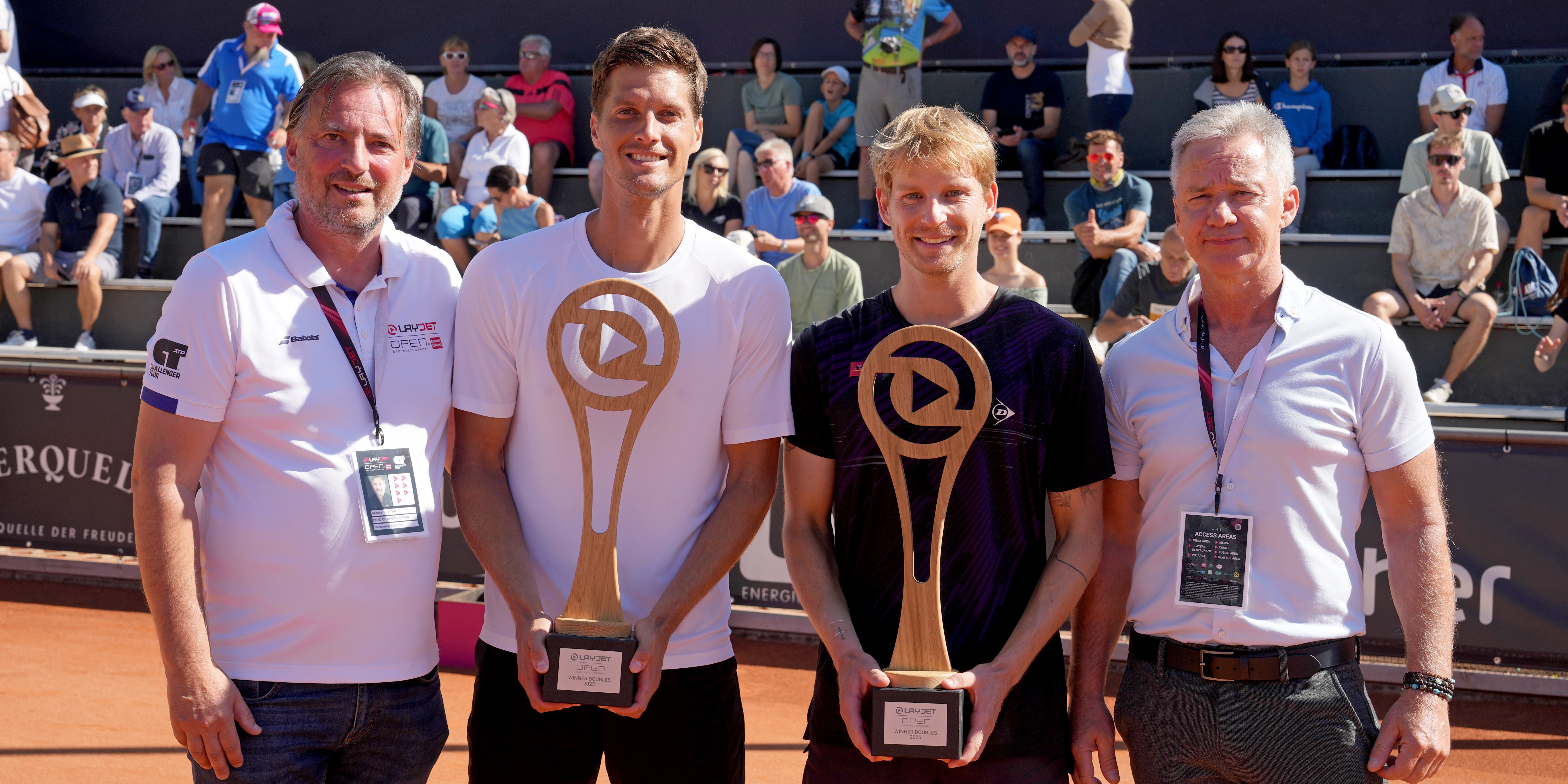 Bei der Doppelsiegerehrung von links nach rechts: Sascha Freitag (Turnierdirektor), 1. Nino Serdarusić und David Pichler, Rainer Dunst (LAYJET-Geschäftsführer).