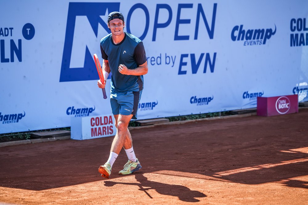 Pünktlich um 14:00 Uhr enterten dann die Nummer eins von Tulln, der in Niederösterreich ansässige Brite und Vorjahressieger Jan Choinski (ATP 150), und Österreichs vom Publikum besonders herzlich empfangener Shootingstar Joel Schwärzler (ATP 262) den voll besetzten Centre Court. Und die Begegnung des 29-jährigen Titelverteidigers mit seinem exakt zehn Jahre jüngeren Kontrahenten hielt, was sich die Fans von ihr versprochen hatten. Beide bauten am Tullner Sand zurecht auf ihre starken Aufschläge, aber obwohl Choinski mehr erste Kracher im Feld unterbringen konnte und Schwärzler vier Breakbälle abzuwehren hatte, konnte die ehemalige Nummer eins der Juniorenweltrangliste ihr Level Game für Game steigern und letztlich das Tiebreak auch dank extrem druckvoller Topspin-Grundschläge mit 7:3 für sich entscheiden.